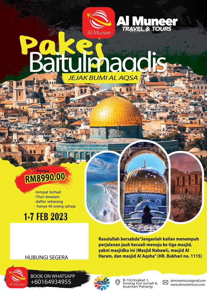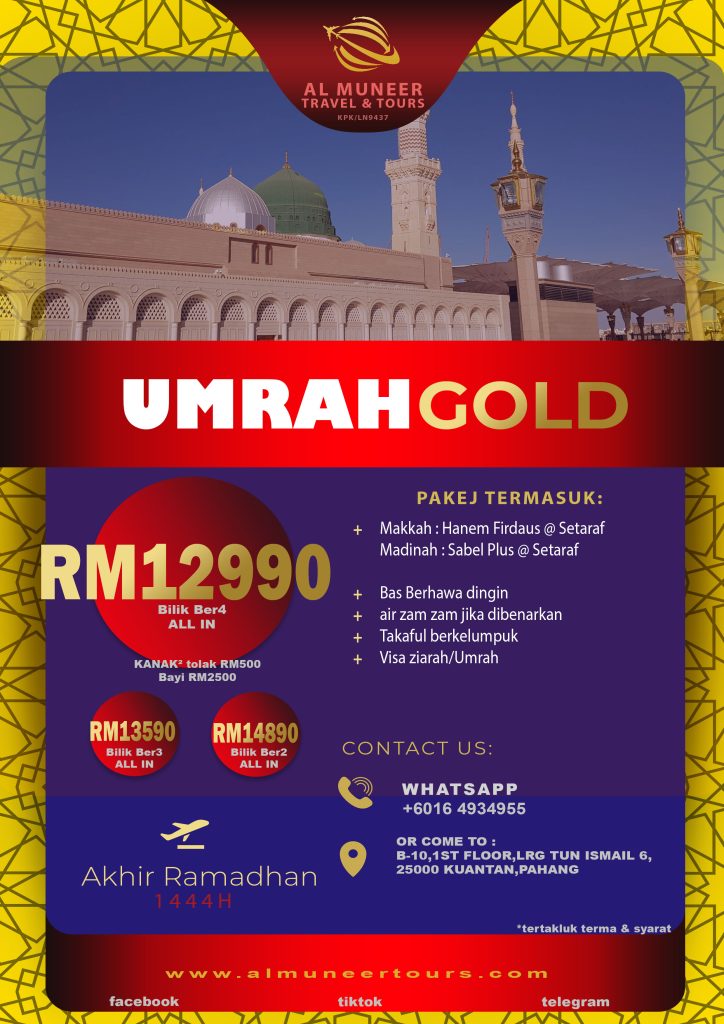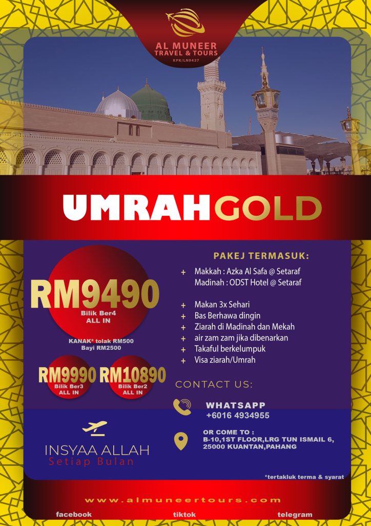 Pakej & Service bermula dengan niat “Ya Allah Aku memohon untuk mengerjakan ibadah Umrah dengan Masa Terdekat bersama Al Muneer Travel & Tours Sdn Bhd” Umrah gold Umrah akhir ramadhan Palestin Booking Now Click here Click here cameron highland 2d1n Click here Air Terjun Pelangi Rainbow Waterfall Click here Air terjun Pandan Click here Tioman Island 3D2N Click here Kenong Experience Click here Click here Perkhidmatan Kami Selain ini kami juga menawarkan pakej keluarga,VIP,Koperat dan Private Group Private Group:Inbound/outbound & Umrah Transportation: Air & Land Charted Hiking- Team building - MICE - Event